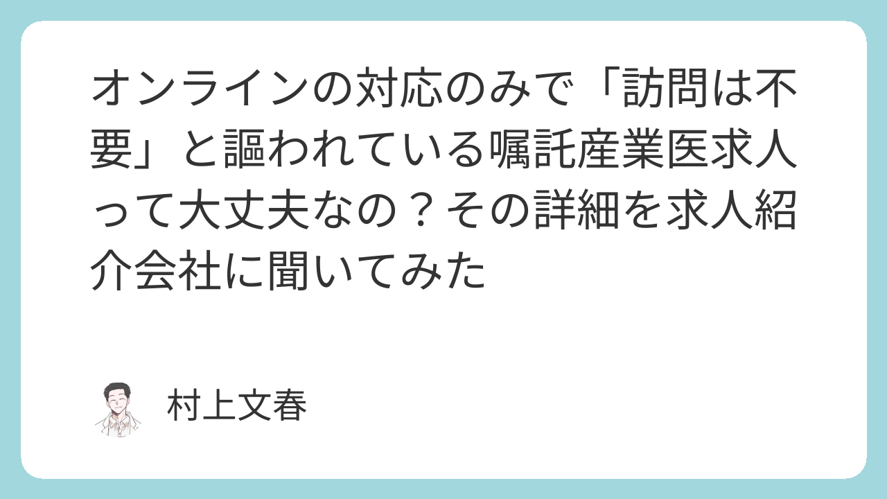 上記の「おためしプラン」での話が、どうやらこの求人紹介会社が扱う産業医求人全体の話と混同されてしまっていたため、「産業医にオンラインだけ・訪問もしなくて良い、その代わり安く買い叩いている」というような誤解をされていたようです。