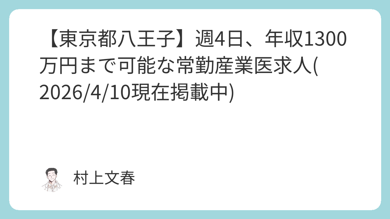 【東京都八王子】週4日、年収1300万円まで可能な常勤産業医求人(2026/4/10現在掲載中)