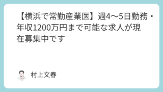 産業医求人情報 【横浜で常勤産業医】週4~5日勤務・年収1200万円まで可能な求人が現在募集中です 横浜は比較的、常勤産業医求人を見かけることがあり、住んでおられる方はわざわざ東京で探すというよりは、お近くの求人を探したいというニーズもあるのではないでしょうか。「今まで都内勤務だったけど、これからは横浜での勤務を希望する」といった、二社目... 2025.10.16 産業医求人情報
